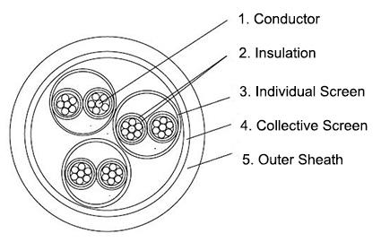 Collectively screened by copper-backed polyester tape with tinned copper drain wire -