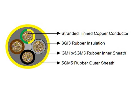 Outer Sheath: Rubber type 5GM5, abrasion and tear resistant, oil resistant and flame retardant