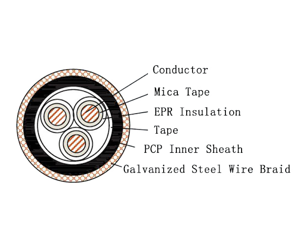 The CEF90/NA EPR Insulated Armored Marine Power Cable is a heavy-duty fire-resistant cable engineered for safety-critical circuits in the most demanding environments. Its core is protected by mica glass tape and EPR insulation to ensure circuit integrity during fire, combined with a robust PCP inner sheath and galvanized steel wire braid armor for superior mechanical and corrosion protection. Designed without an outer sheath, it is ideal for installations where maximum durability and fire survival are paramount.