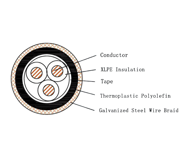 The CJPF90/SC XLPE Insulated Armored Marine Power Cable is engineered for demanding applications that require robust mechanical protection alongside enhanced fire safety features. It utilizes XLPE insulation for high electrical integrity and thermal resistance, a low-smoke, zero-halogen (LSZH) thermoplastic polyolefin (SHF1) inner sheath, and is armored with a heavy-duty galvanized steel wire braid. This design provides reliable flame retardancy (IEC 60332), minimizes hazardous smoke and gas emissions, and offers superior protection against impact, crushing, and corrosion.
