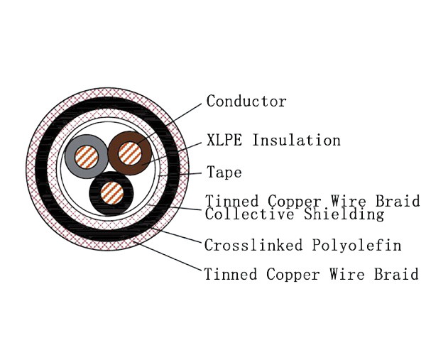 The CJPJP80/SC is a specialized marine power cable designed for applications requiring a combination of enhanced thermal/mechanical performance from the inner sheath and flexible, corrosion-resistant armor. Its key feature is the use of a Cross-linked Polyolefin (SHF2) inner sheath, which offers superior temperature and deformation resistance compared to standard thermoplastic sheaths. Combined with XLPE insulation, a collective screen, and a tinned copper wire braid armor, this cable provides a reliable and durable solution for dynamic or fixed installations where both electrical integrity and mechanical flexibility are critical.