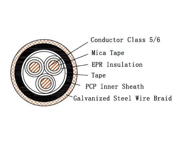 The CEFR90/NA is a heavy-duty, fire-resistant marine flexible power cable engineered for critical safety circuits that demand both certified circuit integrity during a fire and superior mechanical protection. It combines Ethylene Propylene Rubber (EPR) insulation for electrical reliability, a resilient Polychloroprene (PCP) inner sheath, and galvanized steel wire braid armor. This robust construction is designed to ensure the continued operation of emergency and life-safety systems in the most physically demanding and hazardous environments on vessels and offshore installations.