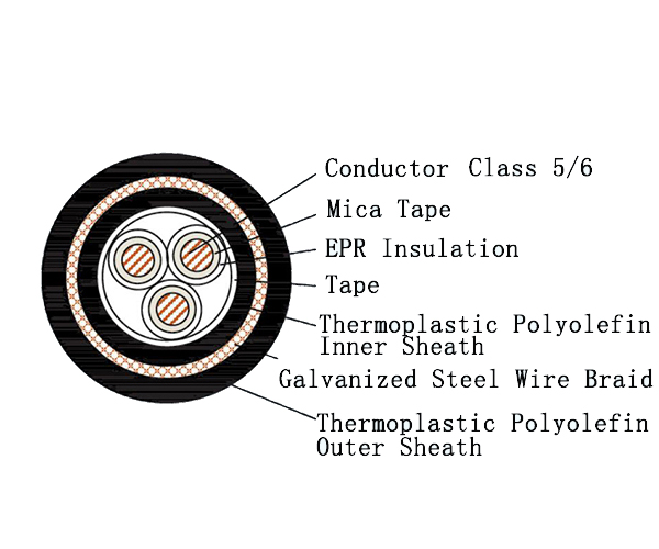 The CEPFR96/NC represents the ultimate in safety and durability for halogen-free marine flexible power cables. It is a premium halogen-free, low-smoke, fire-resistant cable engineered for the most critical circuits where maintaining operation during a fire, withstanding extreme physical stress, and providing full environmental protection are all essential. This cable combines Ethylene Propylene Rubber (EPR) insulation, a complete thermoplastic polyolefin (SHF1) dual-sheath system, and galvanized steel wire armor to deliver an uncompromising solution for vital safety and power systems in the most severe marine and industrial environments.