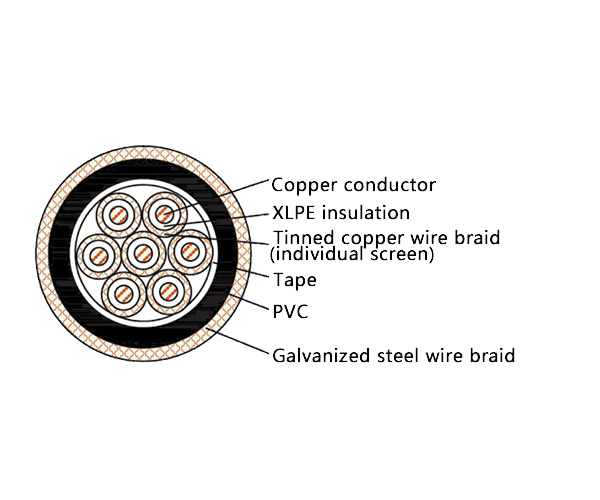 The CKJVP90/SA is a heavy-duty, screened and armored marine control cable designed for applications requiring robust electromagnetic interference (EMI) protection and maximum mechanical strength in a streamlined construction. It integrates XLPE insulation, an effective electrical screening layer, and a protective galvanized steel wire armor beneath a single PVC inner sheath (with no outer oversheath). This design is ideal for installations where the armor needs to be accessible for grounding and where superior crush resistance and EMI shielding are critical, all while meeting IEC 60092 flame retardant standards.