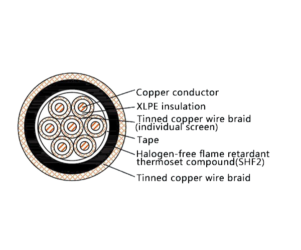 The CKJPJP80/SC is a high-performance Low Smoke Halogen Free (LSHF), Flame Retardant, and Screened marine control cable designed for applications requiring enhanced fire safety, electromagnetic compatibility, and flexible mechanical protection in a streamlined design. It combines XLPE insulation, an effective EMI screen, and a flexible tinned copper wire braid armor under a single, durable Cross-linked Polyolefin (SHF2) sheath (no outer oversheath). This construction is ideal for grounding-ready installations where flexibility, signal integrity, and LSHF safety are critical, in full compliance with IEC 60092, IEC 60754 (Halogen Free), and IEC 61034 (Low Smoke) standards.