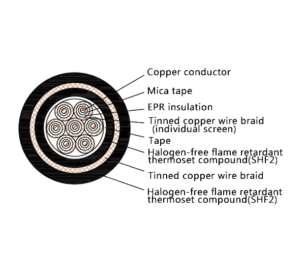 The CKEPJP85/NC is an advanced Fire Resistant and Low Smoke Halogen Free (LSHF) marine control cable, engineered for critical safety and control systems that demand the highest levels of operational integrity and personnel safety during fire incidents. Featuring a mica glass tape and EPR insulation core for certified fire resistance, combined with Halogen-Free Low Smoke properties, an EMI/RFI screen, and a flexible tinned copper wire braid armor within a double-layer Cross-linked Polyolefin (SHF2) sheath, this cable provides an optimal balance of protection, flexibility, and signal clarity for the most demanding applications.