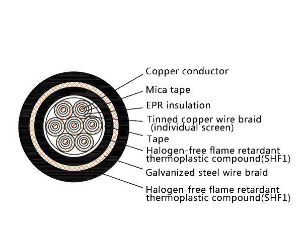 The CKEPFP96/NC is a robust Fire Resistant and Low Smoke Halogen Free (LSHF) marine control cable engineered for the most critical safety and control circuits where operational integrity during a fire and ultimate personnel safety are non-negotiable. It combines EPR insulation with a mica glass tape barrier for certified fire resistance, Halogen-Free Low Smoke safety properties, an EMI/RFI screen, and heavy-duty galvanized steel wire armor within a double-layer Thermoplastic Polyolefin (SHF1) sheath. This comprehensive construction is designed for vital systems in extreme marine, offshore, and industrial applications.