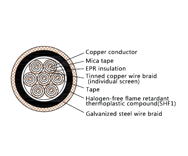 The CKEPFP90/NC is a high-integrity Fire Resistant and Low Smoke Halogen Free (LSHF) marine control cable designed for critical power, lighting, and control circuits where operational continuity during a fire is imperative and personnel safety is enhanced. It features a mica glass tape and EPR insulation core for certified fire resistance, Halogen-Free Low Smoke safety properties, an EMI/RFI screen, and galvanized steel wire armor. This cable is protected by a single Thermoplastic Polyolefin (SHF1) inner sheath with no outer oversheath, offering a streamlined, grounding-ready solution for the most demanding marine, offshore, and industrial safety applications.