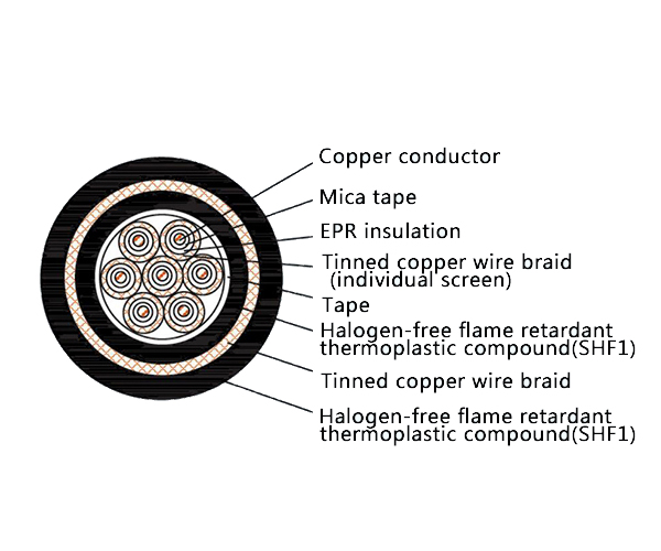 The CKEPFP86/NC is an advanced Fire Resistant and Low Smoke Halogen Free (LSHF) marine control cable, engineered for critical safety and control systems that demand the highest levels of operational integrity and personnel safety during fire incidents. Featuring a mica glass tape and EPR insulation core for certified fire resistance, combined with Halogen-Free Low Smoke properties, an EMI/RFI screen, and a flexible tinned copper wire braid armor within a double-layer Thermoplastic Polyolefin (SHF1) sheath, this cable provides an optimal balance of protection, flexibility, and signal clarity for the most demanding applications.