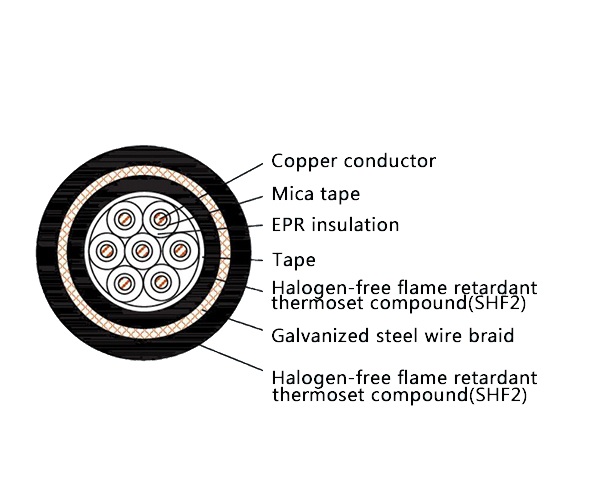 The CKEPJ95/NC represents a top-tier, heavy-duty armored Fire Resistant marine control cable, engineered for the most demanding applications where maximum mechanical protection and ultimate fire safety are required. It combines the critical IEC 60331 fire resistance and Low Smoke Halogen Free (LSHF) safety features with a robust construction featuring galvanized steel wire braid armor and a double-layer Cross-linked Polyolefin (SHF2) sheath. This cable is designed to ensure circuit integrity under fire, withstand severe mechanical stress, and resist harsh environmental conditions on ships, offshore platforms, and in extreme industrial settings.