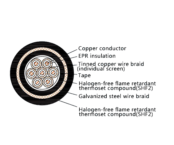 The CKEPJP95/SC is a high-performance, fully protected marine control cable engineered for the most demanding and high-interference environments. It combines EPR insulation with an overall screen (P) and galvanized steel wire braid armor (9), all sheathed in Halogen-Free, Low Smoke Flame Retardant (LSHF) cross-linked polyolefin (SHF2). This design provides unparalleled electromagnetic shielding, mechanical protection, and fire safety for critical power, lighting, and control circuits on ships, offshore platforms, and in harsh industrial settings.