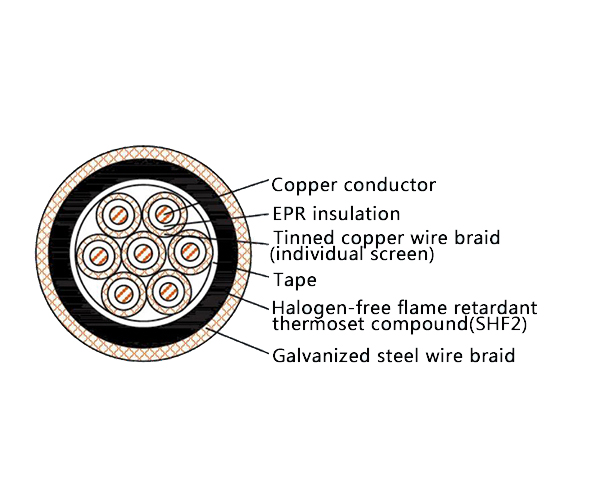The CKEPJP90/SC is a heavy-duty, screened and galvanized steel wire armored (GSWA) marine control cable designed for maximum protection in high-interference and physically demanding environments. It features EPR insulation, a Low Smoke Halogen Free Flame Retardant (LSHF) cross-linked polyolefin (SHF2) inner sheath, and is supplied without an overall outer sheath (Code 0). This configuration is ideal for direct installation within protected enclosures, panels, or as a sub-component in multi-layer systems where external mechanical protection is provided separately.