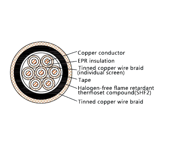 The CKEPJP80/SC is a highly flexible, screened and copper braid armored marine control cable designed for installation within protected enclosures where space, flexibility, and electromagnetic compatibility are critical. It features EPR insulation, a Low Smoke Halogen Free Flame Retardant (LSHF) cross-linked polyolefin (SHF2) inner sheath, and is supplied without an overall outer sheath (Code 0). Its dual-layer tinned copper braid construction provides excellent EMI shielding and flexible mechanical protection, making it ideal for panel wiring, cabinet internals, and other controlled environments on ships and offshore installations.