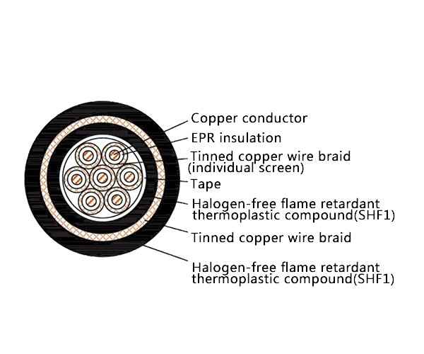 The CKEPFP86/SC is a premium screened marine control cable designed for reliable signal and power transmission in critical control systems. It combines EPR insulation, individual pair electromagnetic screening, flexible tinned copper braid armor, and a Low Smoke Halogen Free (LSHF) flame-retardant outer sheath. This construction ensures excellent EMI protection, mechanical resilience, and enhanced safety for use on ships, offshore platforms, and in demanding industrial plants, fully complying with IEC 60092 standards.