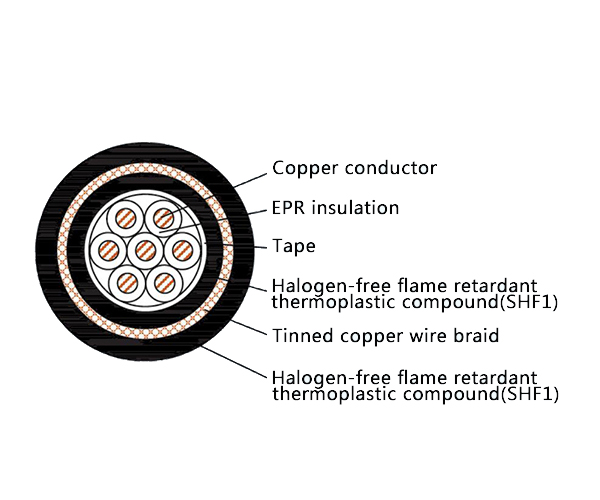 The CKEPF86/SC is a flexible and durable Low Smoke Halogen Free (LSHF) Flame Retardant marine control cable engineered for applications requiring excellent mechanical protection, enhanced safety, and electromagnetic shielding. It features EPR insulation, a double layer of Thermoplastic Polyolefin (SHF1) sheath, and a flexible tinned copper wire braid armor. This construction provides superior flexibility for easier installation, effective EMI/RFI shielding, and the critical fire safety benefits of low smoke and zero halogen emission, ensuring full compliance with IEC 60092 standards for marine and industrial control systems.