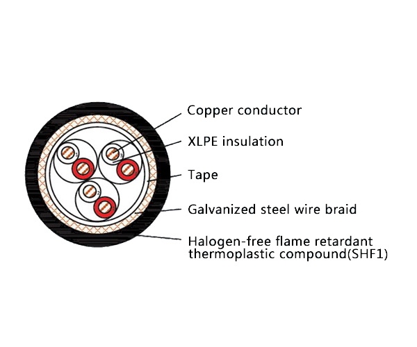 The CHJ96/SC is a robust Low Smoke Halogen Free (LSHF) Flame Retardant marine communication cable designed for reliable telecommunication, instrumentation, and data transmission in demanding environments. It features XLPE (Cross-linked Polyethylene) insulation for superior electrical performance, heavy-duty galvanized steel wire armor for mechanical protection, and a Low Smoke Halogen Free (SHF1) thermoplastic polyolefin outer sheath. This cable provides enhanced fire safety and durability for critical communication systems on ships, offshore platforms, and in industrial applications, fully complying with IEC 60092 standards.