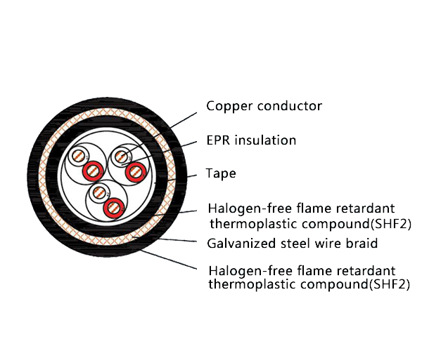 The CHEPF96/SC is a robust and safety-compliant armored marine communication cable, engineered to deliver reliable performance in exposed or physically demanding installations. It combines EPR insulation, galvanized steel wire armor, and a dual-layer Thermoplastic Polyolefin (SHF1) sheath within a full Low Smoke Halogen Free (LSHF) Flame Retardant construction. This design provides an optimal balance of mechanical durability, fire safety, and cost-effectiveness for critical communication and control circuits in harsh marine and industrial environments.