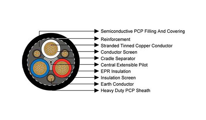 | Central Extensible Pilot (1×) | EPR covered flexible stranded tinned copper conductor. |