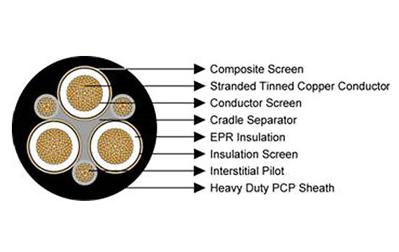 | Interstitial Pilots (3×) | Three EPR-insulated flexible stranded tinned copper conductors (large pilots), positioned in interstices between power cores. |