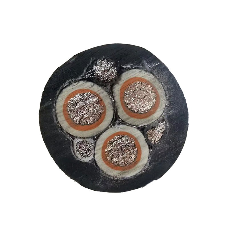 Three tinned copper braided screened power cores + three unscreened pilot cores (one in each interstice) laid up right-hand around a semi-conductive cradle centre. -